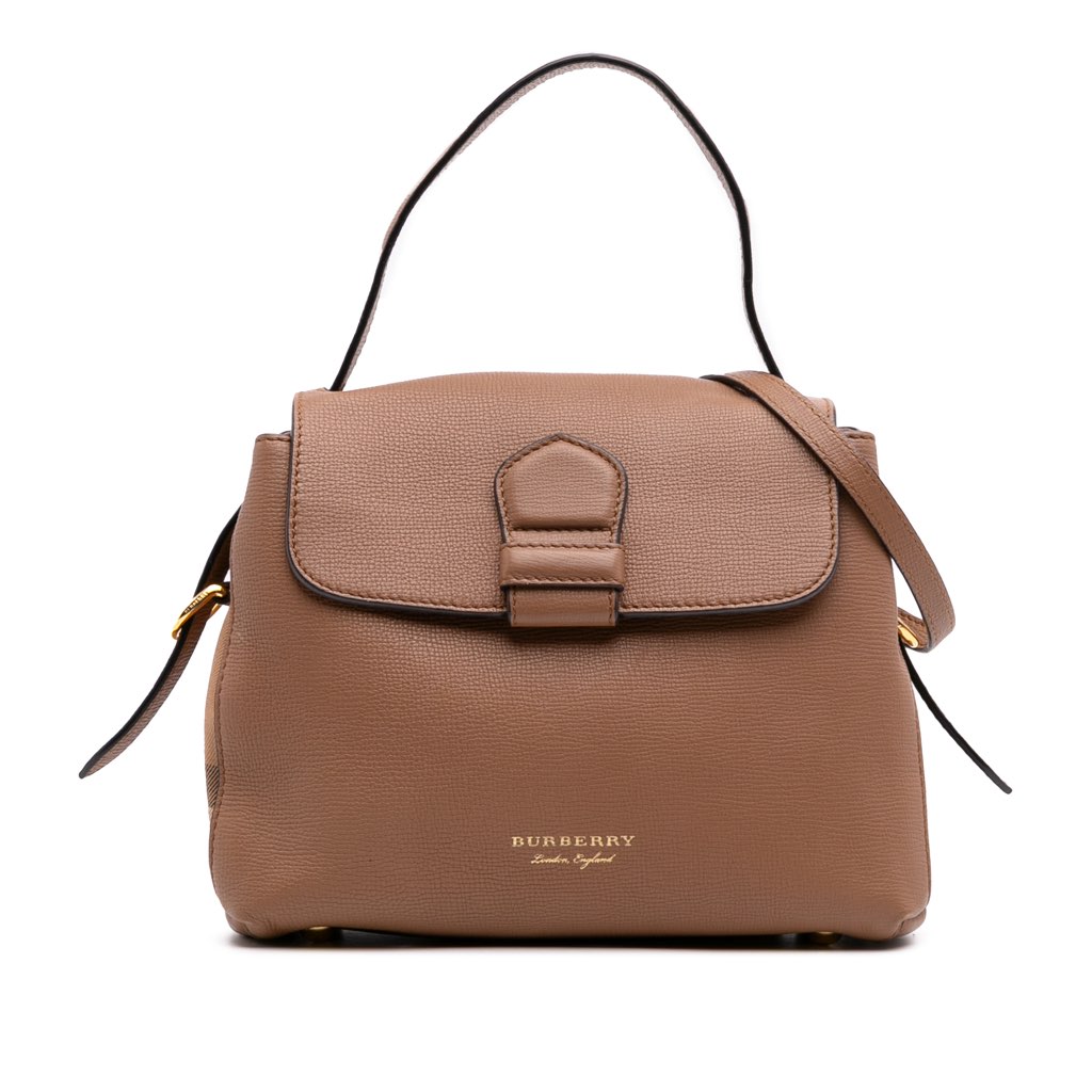 The Camberley satchel features a leather body with canvas trim, a flat leather handle, a detachable flat leather strap, a front flap with slip-on closure, and interior slip and zip pockets.
