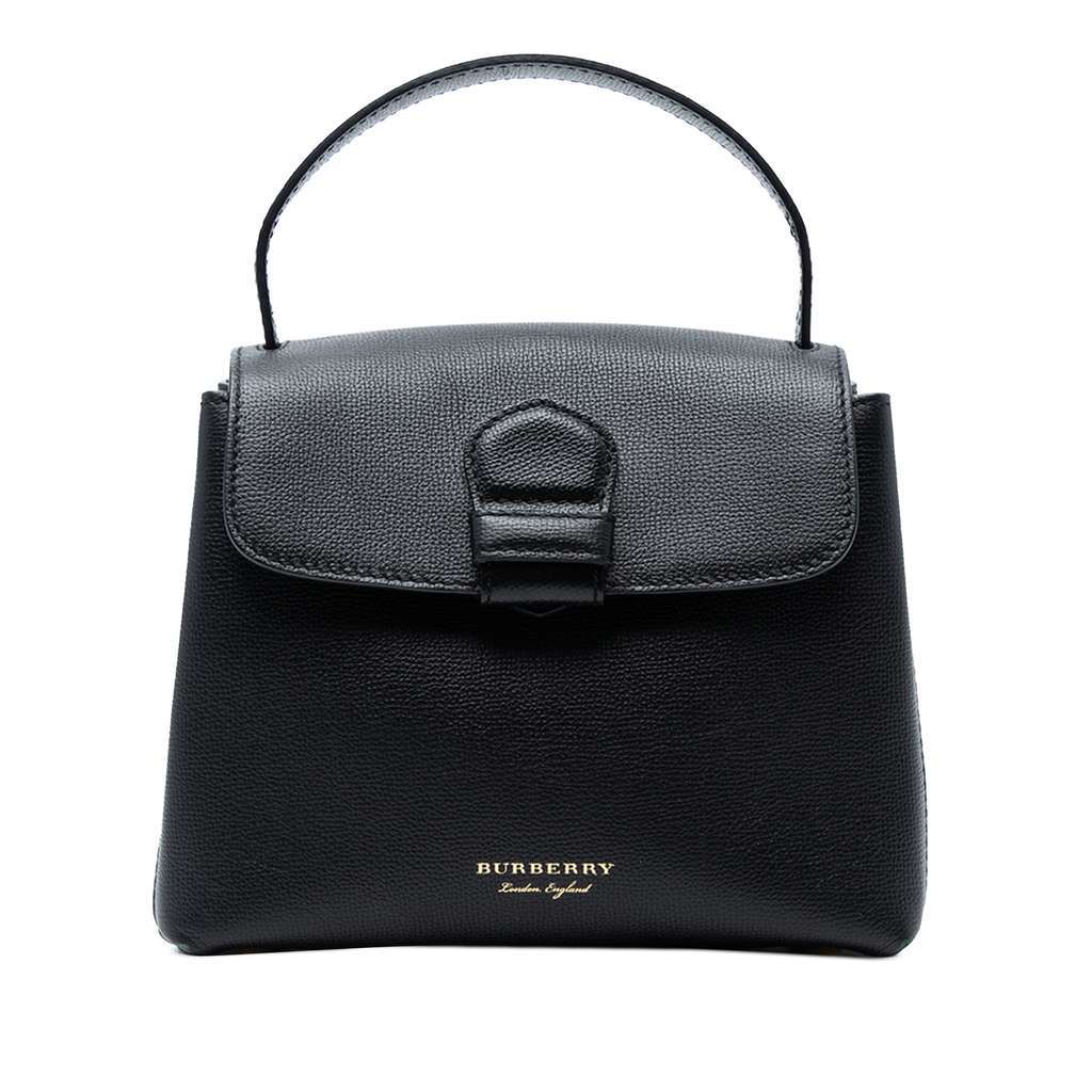 The Camberley satchel features a leather body with house check canvas side panels, a flat leather handle, a front flap with slip-on closure, and an interior zip and slip pockets.