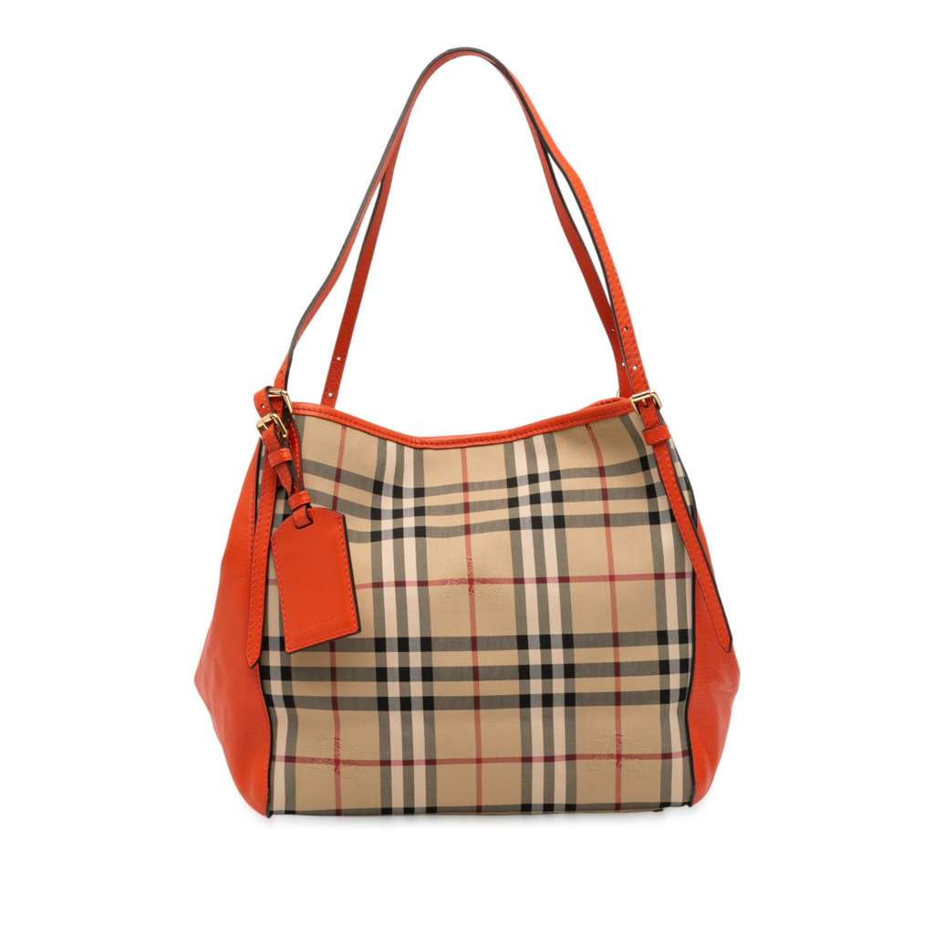 The Canterbury tote bag features a haymarket check canvas body with leather side panels, adjustable flat leather handles, an open top with snap button closures, and interior zip and slip pockets.
