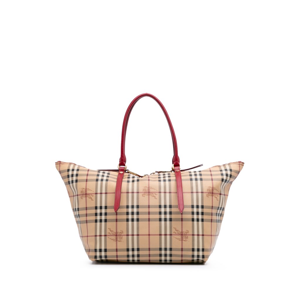 The Salisbury Tote features a haymarket check coated canvas body, rolled leather straps, a top zip closure, and an interior zip pocket.
