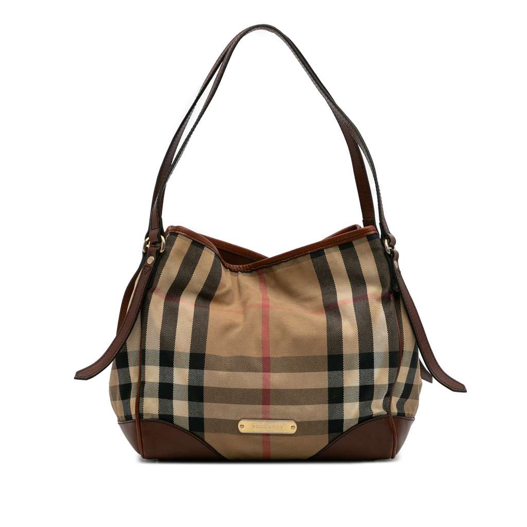 The Canterbury tote bag features a house check canvas body with leather trim, flat leather straps, an open top with magnetic snap button closure, and interior zip and slip pockets.