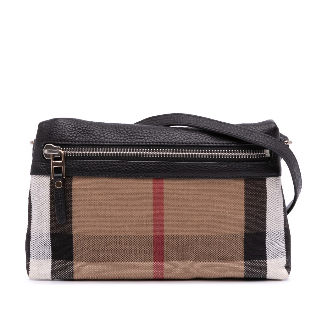 The Farley crossbody features a house check canvas body with leather trim, a detachable flat leather strap, and a front zip closure.