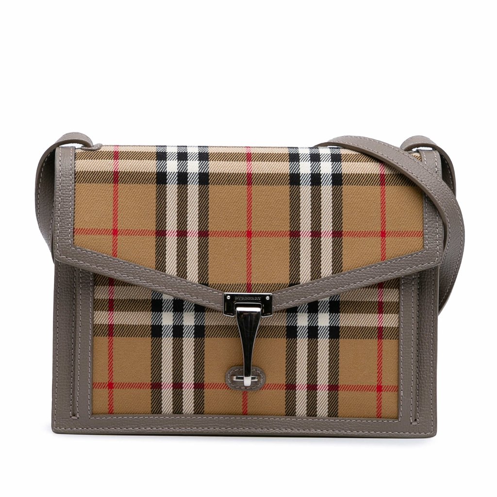 The Macken features a canvas body with leather trim, an adjustable flat leather strap, a front flap with a clasp closure, an exterior slip pocket, and an interior slip pocket.