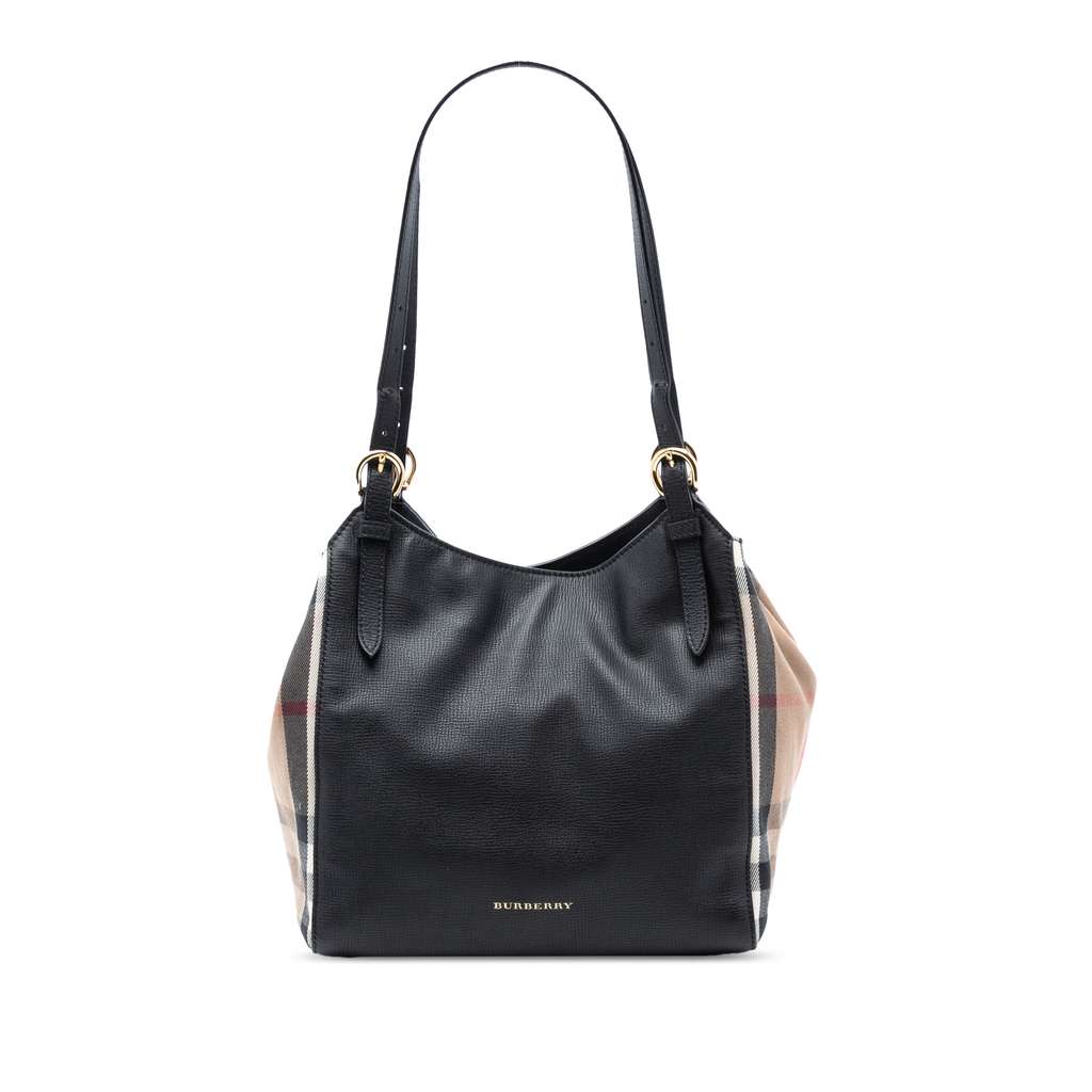 The Canterbury tote bag features a leather body with canvas trim, flat leather handles, an open top with a magnetic snap button closure, and interior zip and slip pockets.
