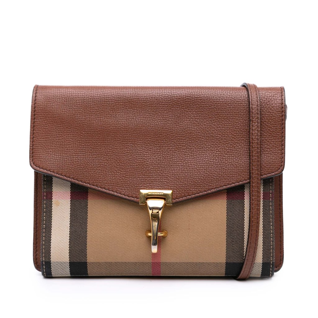 The Macken features a house check canvas and leather body, an adjustable flat leather strap, a flap with a clasp closure, an exterior back zip pocket, and an interior slip pocket.