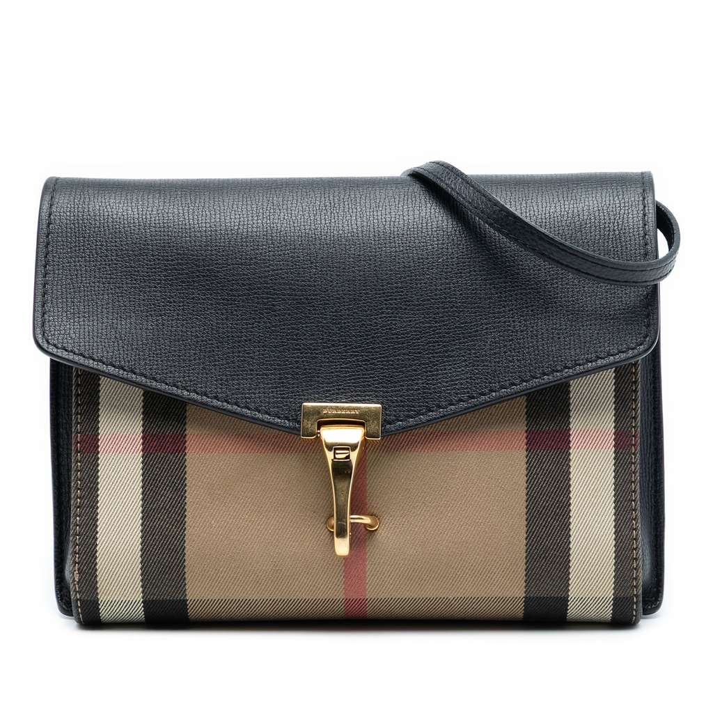 The Macken features a house check canvas and leather body, an adjustable flat leather strap, a flap with a clasp closure, an exterior back zip pocket, and an interior slip pocket.
