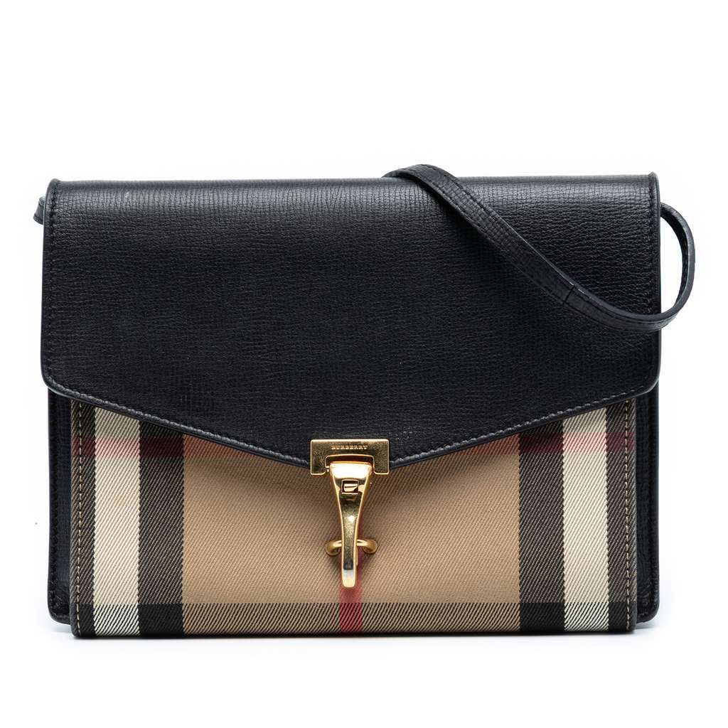 The Macken features a house check canvas and leather body, an adjustable flat leather strap, a flap with a clasp closure, an exterior back zip pocket, and an interior slip pocket.