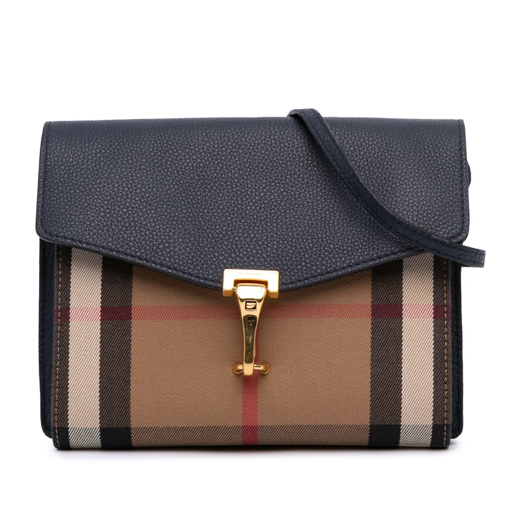 The Macken features a house check canvas and leather body, an adjustable flat leather strap, a flap with a clasp closure, an exterior back zip pocket, and an interior slip pocket.