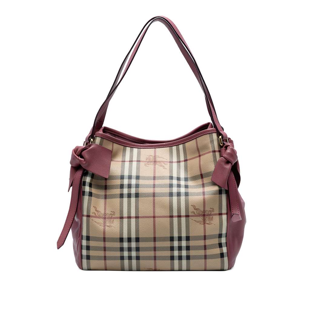 The Canterbury tote bag features a haymarket check coated canvas body with leather trim and bow details, flat leather handles, an open top with snap button closures, and interior zip and slip pockets.