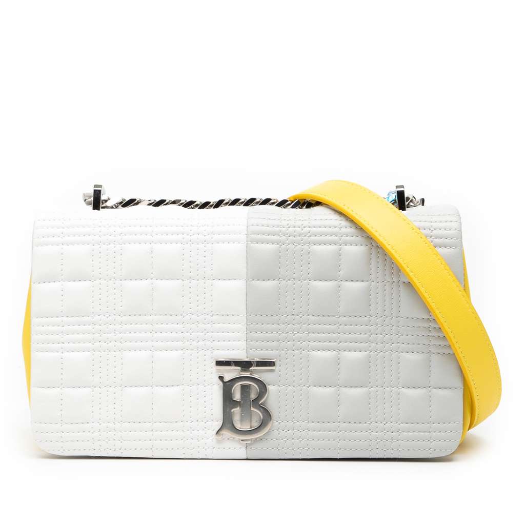 The Lola features a quilted leather body, a chain link strap with leather guard, a front flap with a magnetic snap button closure, and an interior zip pocket.
