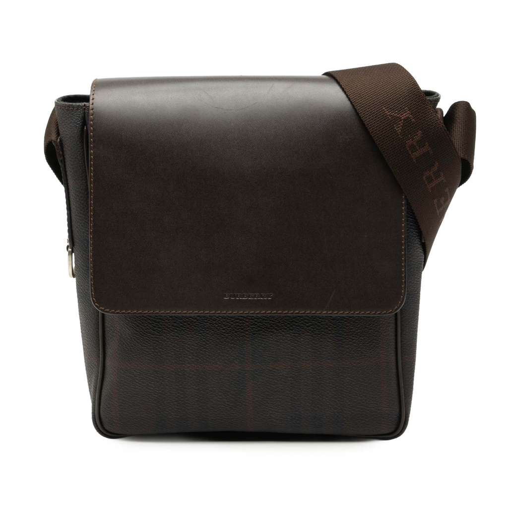 This crossbody bag features a smoke check coated canvas body with leather trim, an adjustable flat canvas strap, a flap with a magnetic snap closure, an exterior back slip pocket, and an interior zip pocket.