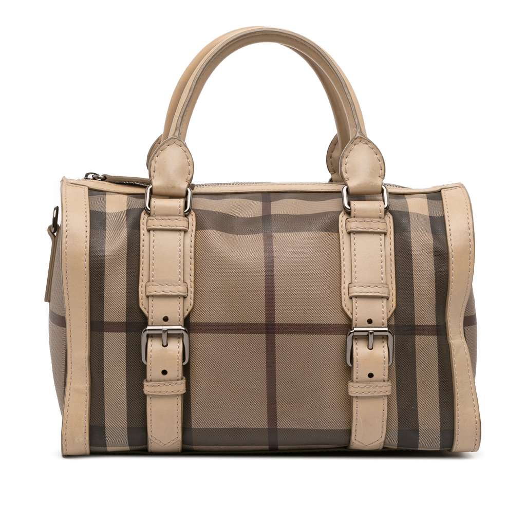 This satchel features a smoke check coated canvas body with leather trim, rolled leather handles, and a top zip closure.