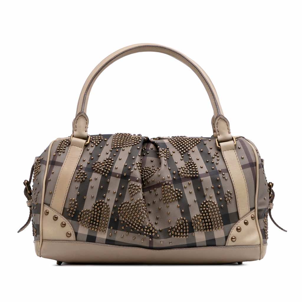 This boston bag features a studded coated canvas body with leather trim, rolled leather handles, a top zip closure, and interior zip and slip pockets. Handles were repainted.