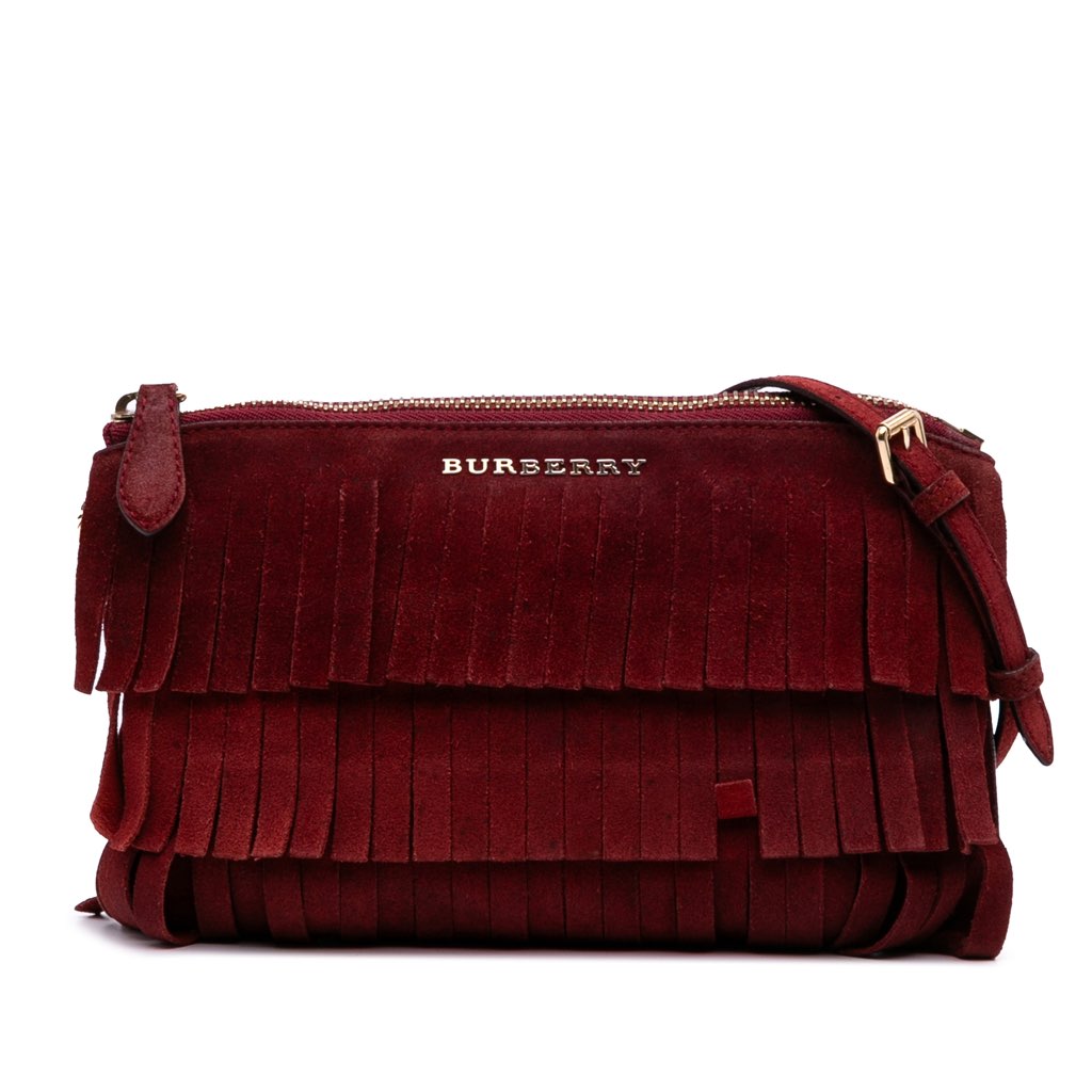 This crossbody bag features a fringed suede body, a chain link and an adjustable flat leather strap, a top zip closure, and interior slip pockets.