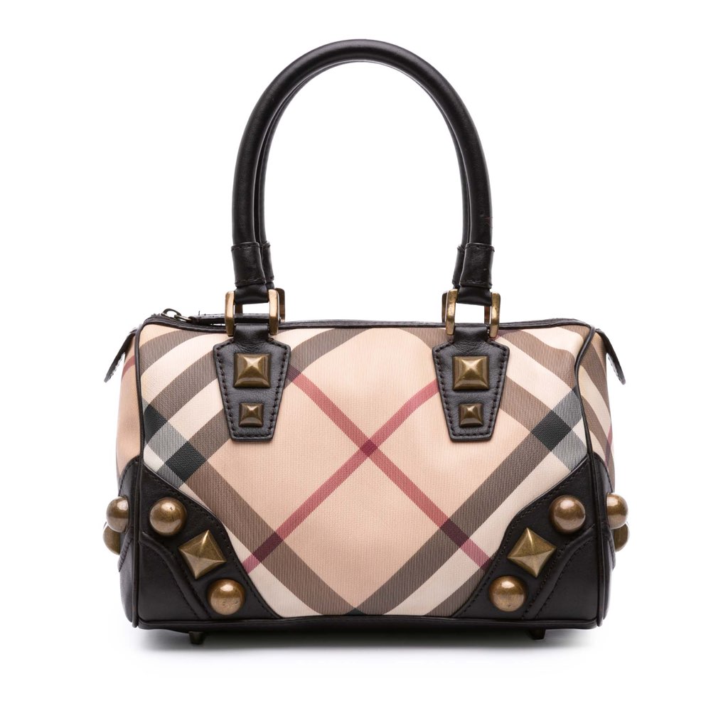 This boston bag features a canvas body with leather trim and stud detail, rolled leather handles, a top zip closure, and interior zip and slip pockets.