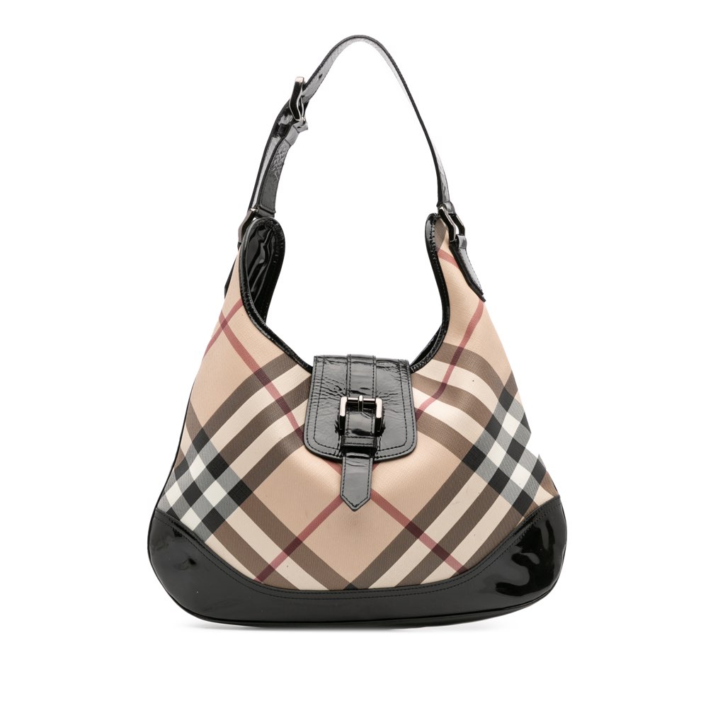 This hobo bag features a supernova check coated canvas body with patent leather trim, a flat leather strap, an open top with a flat buckle strap and magnetic snap closure, and interior zip and slip pockets.