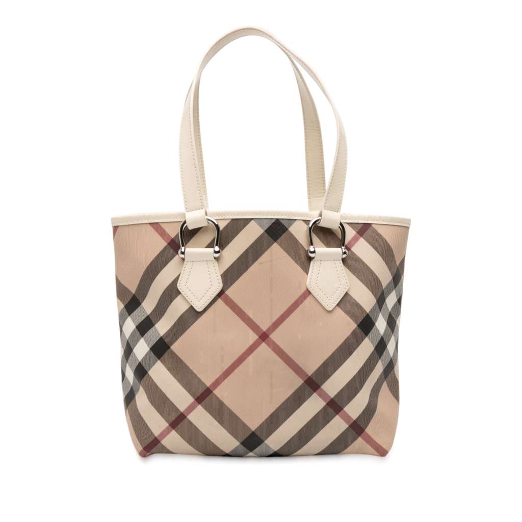 This tote bag features a supernova check coated canvas body with leather trim, flat leather straps, an open top, and an interior zip pocket.
