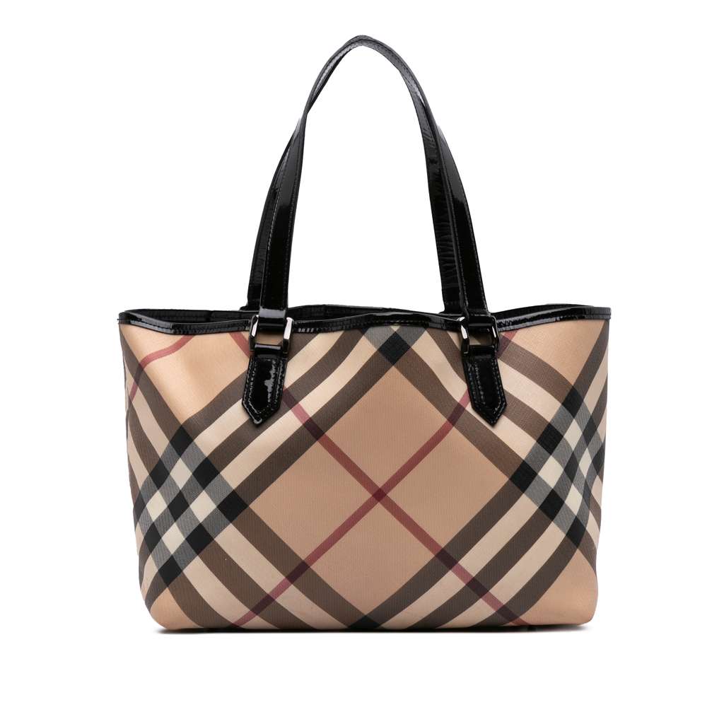 This tote bag features a coated canvas body with patent leather trim, flat patent leather straps, and an open top.