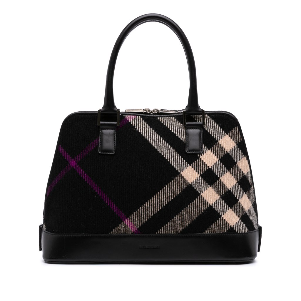 This handbag features a wool body with leather trim, rolled leather handles, a dual zip around closure, and interior zip and slips pockets.
