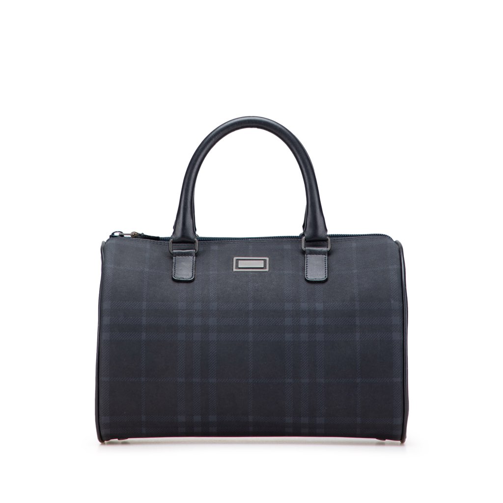 This boston bag features a canvas body with leather trim, rolled leather handles, a top zip closure, and an interior zip pocket.