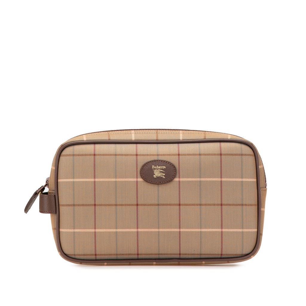 This clutch bag features a plaid canvas body with leather trim, a top zip closure, and an interior slip pocket.