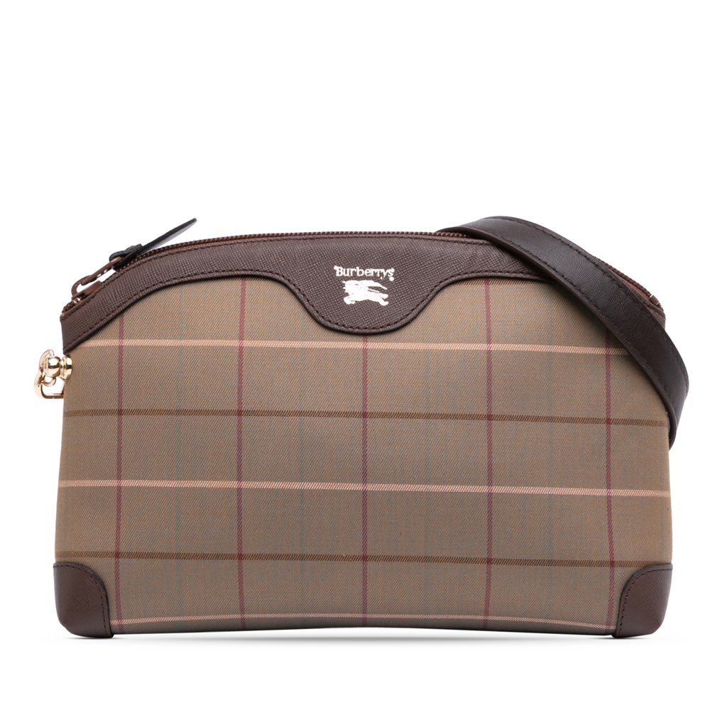This crossbody bag features a canvas body with leather trim, a detachable chain link and leather strap, an adjustable and detachable flat leather strap, and a top zip closure.