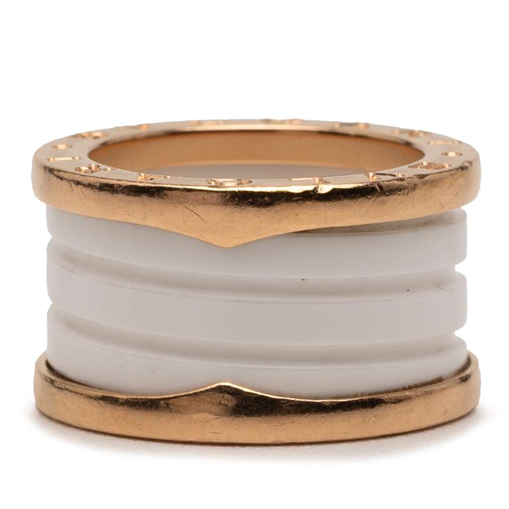 This ring features an 18K rose gold and ceramic body. US Ring Size: 5