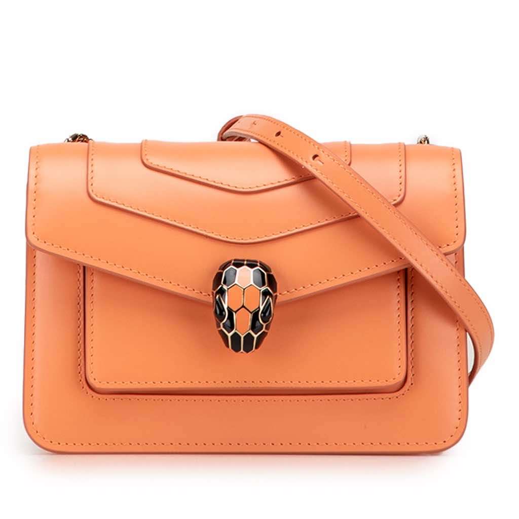 The Serpenti Forever features a leather body, a chain link strap with leather guard, a front flap with magnetic snap closure and serpenti adornment, and interior zip and slip pockets.
