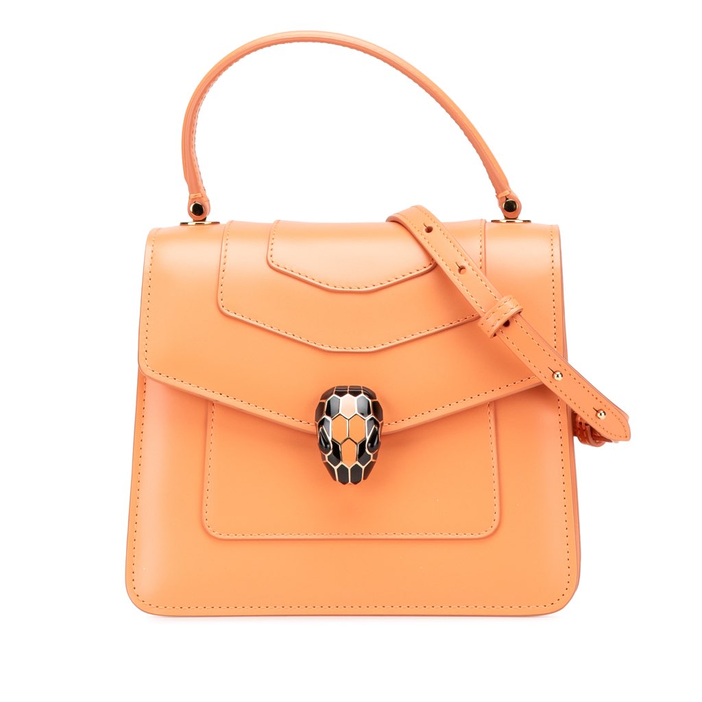 The Serpenti satchel features a leather body, a flat top handle, a detachable gold-tone chain strap, a front flap with snap closure and serpenti adornment, and an interior slip pocket.