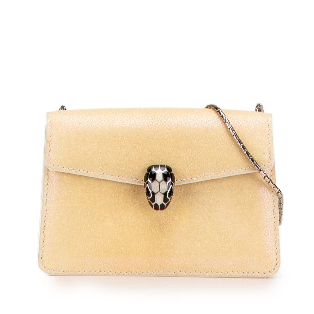 The Serpenti Forever crossbody bag features a leather body, a snake scale chain link strap, a front flap with snap closure with a serpent head adornment, and an interior slip pocket.