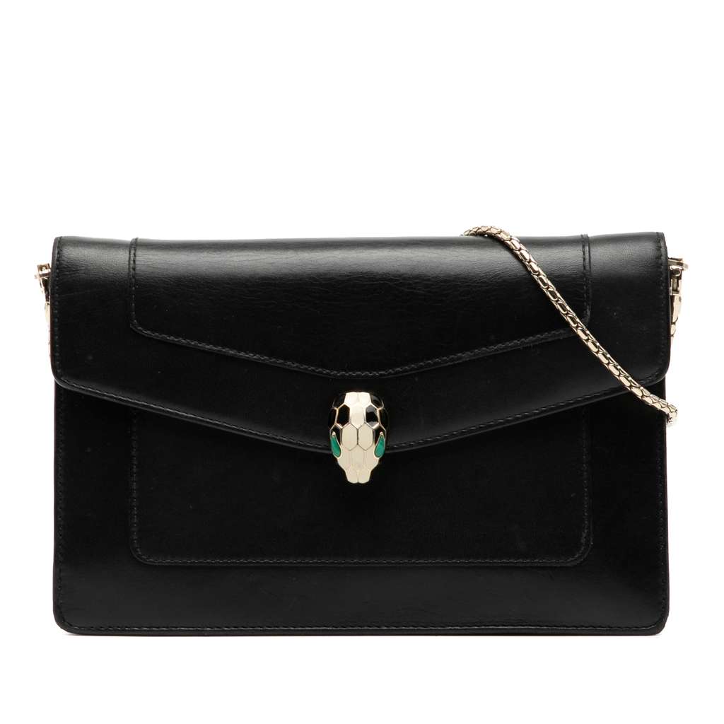 The Serpenti Forever wallet on chain features a leather body, a detachable chain link strap, a front flap with snap closure and serpenti adornment, a zip compartment, and interior slip pockets.