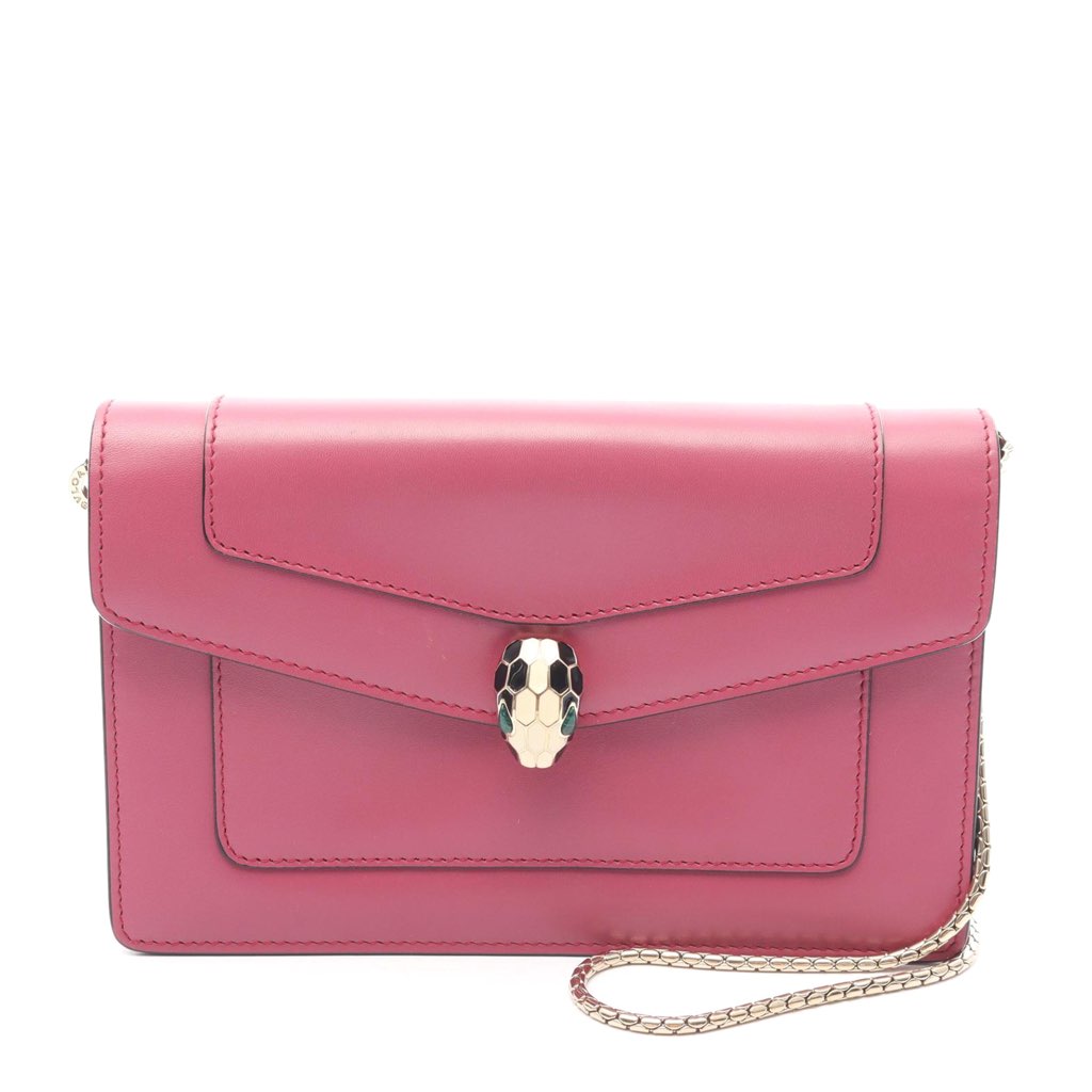 The Serpenti Forever wallet on chain features a leather body, a silver-tone removable chain strap, a front flap with snap closure and serpenti adornment, a zip compartment, and interior slip pockets.