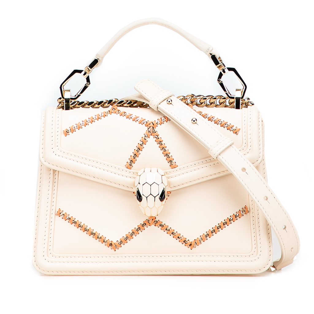 The Serpenti Forever satchel bag features a leather body, a chain link strap with leather shoulder guard, a front flap with magnetic snap closure and serpenti adornment, and an interior slip pocket.