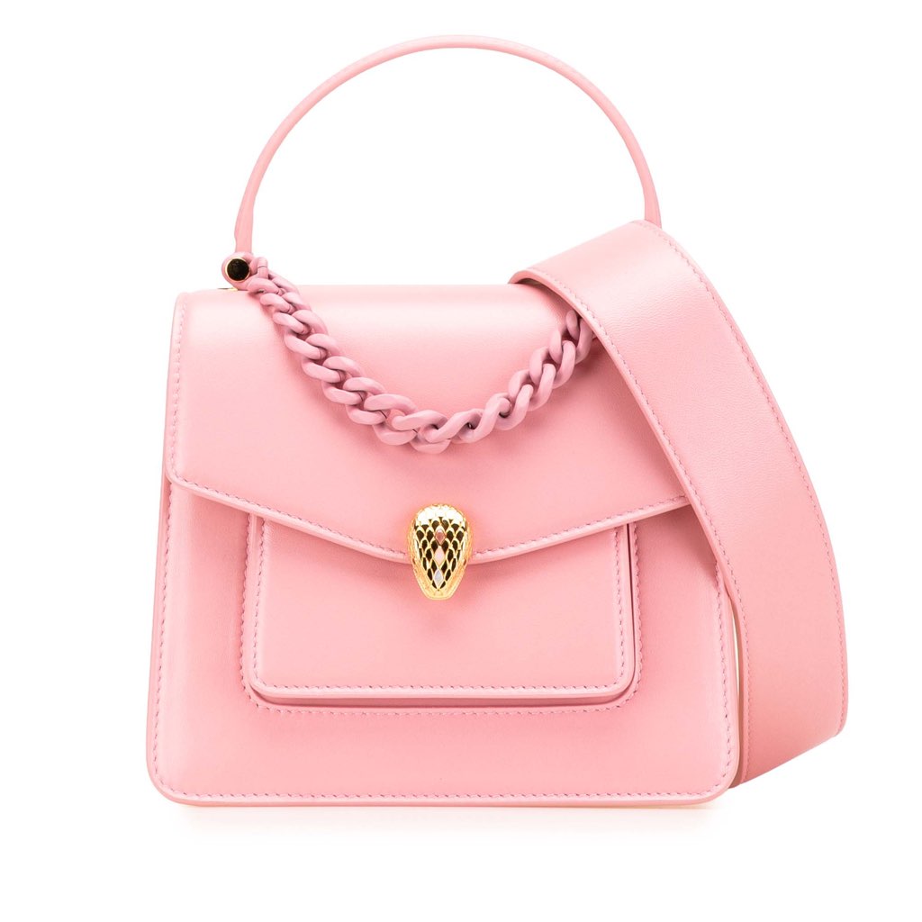 This satchel features a leather body with chain detail, a flat leather top handle, a detachable flat leather shoulder strap, a front flap with snap closure and serpenti adornment, and an interior slip pocket.