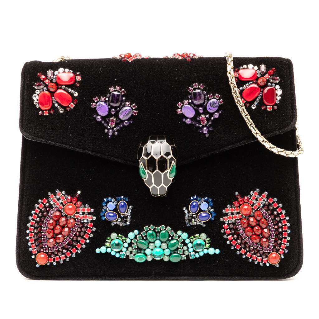 The Serpenti Forever crossbody bag features a velvet body with jewel embellishments, a chain link shoulder strap, a front flap with a snap button closure, and an interior slip pocket.