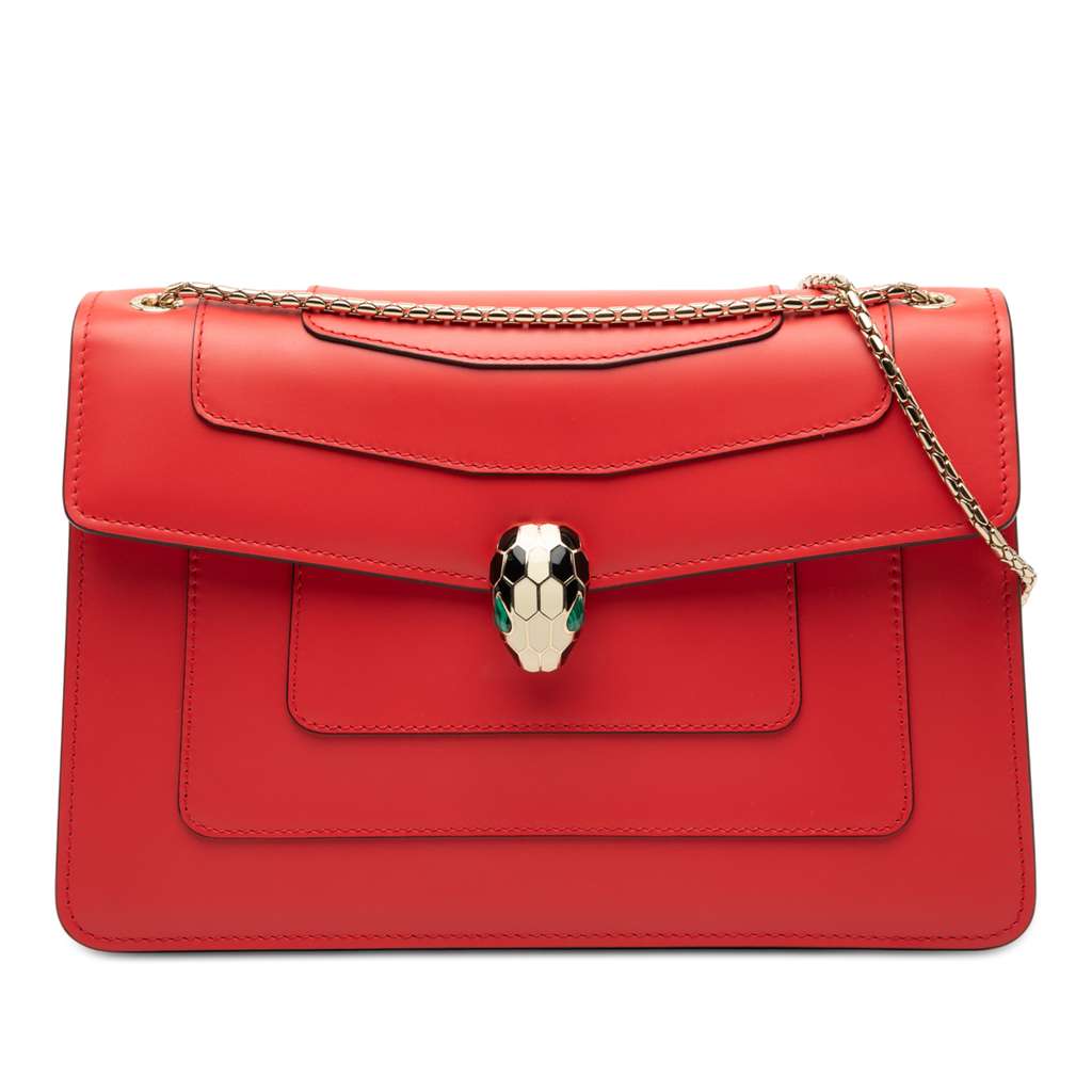 The Serpenti Forever shoulder bag features a leather body, a chain link shoulder strap, a front flap with magnetic snap closure and serpenti adornment, an interior zip compartment, and interior zip and slip pockets.