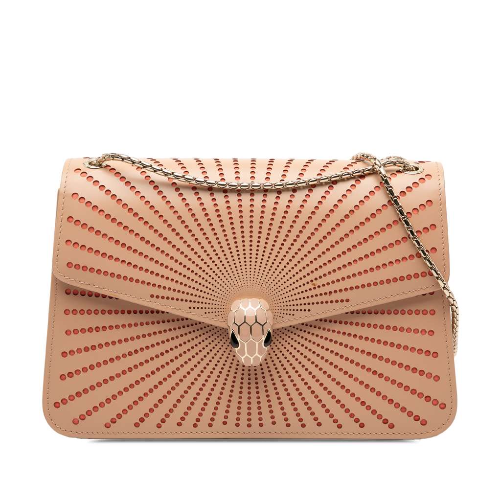 The Serpenti Forever features a laser cut leather body, a chain link shoulder strap, a front flap with magnetic snap closure and serpenti adornment, and interior zip and slip pockets.