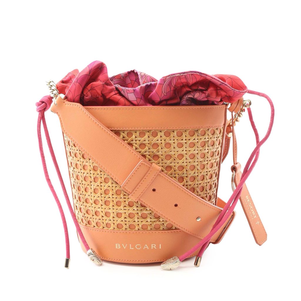 This bucket bag features a rattan body with leather trim, an adjustable flat leather handle, and a top drawstring closure.
