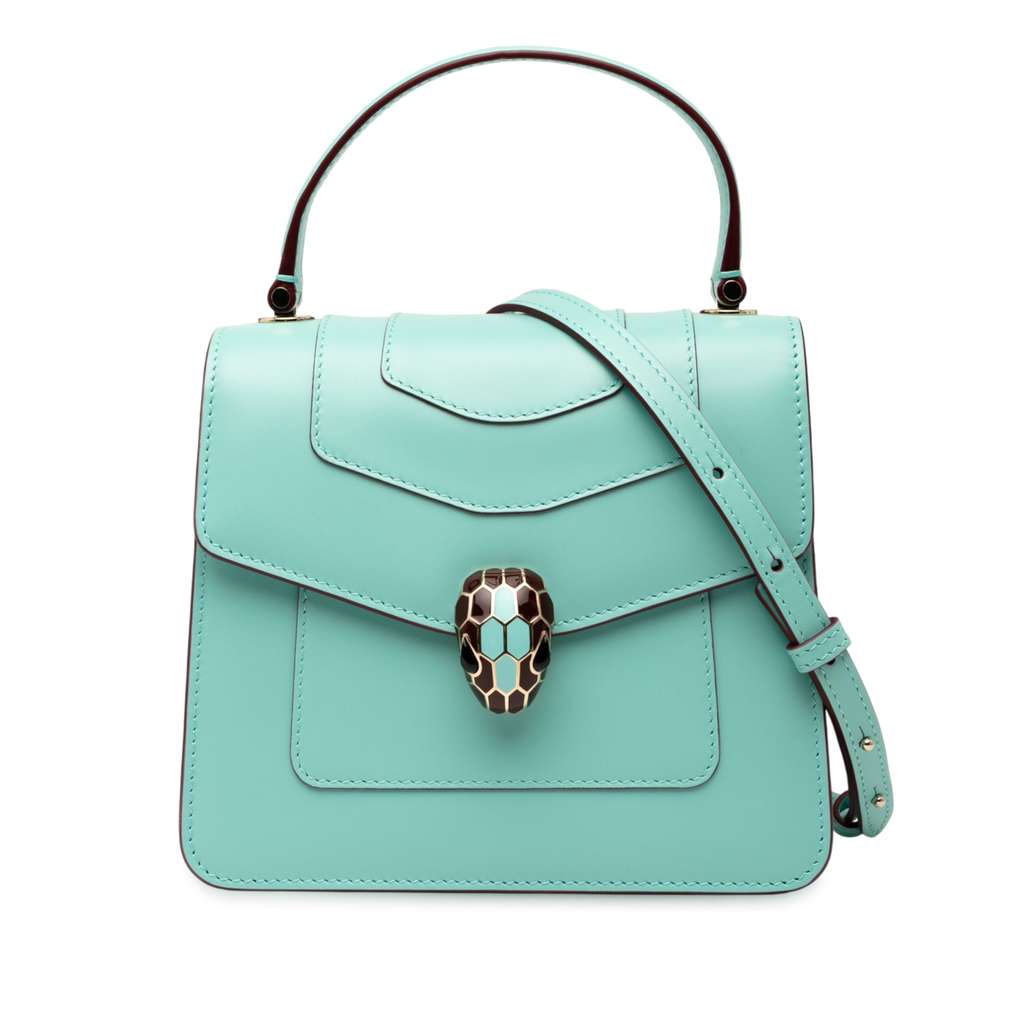 The Serpenti satchel features a leather body, a flat leather top handle, a detachable chain link strap, a front flap with magnetic snap closure and serpenti adornment, and an interior slip pocket.