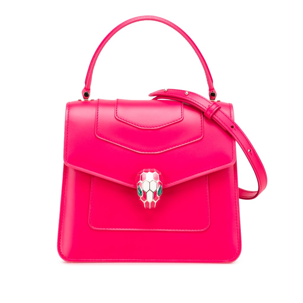 The Serpenti satchel features a leather body, a flat top handle, a detachable chain link strap, a front flap with snap closure and serpenti adornment, an exterior back slip pocket, three interior compartments and a slip pocket.