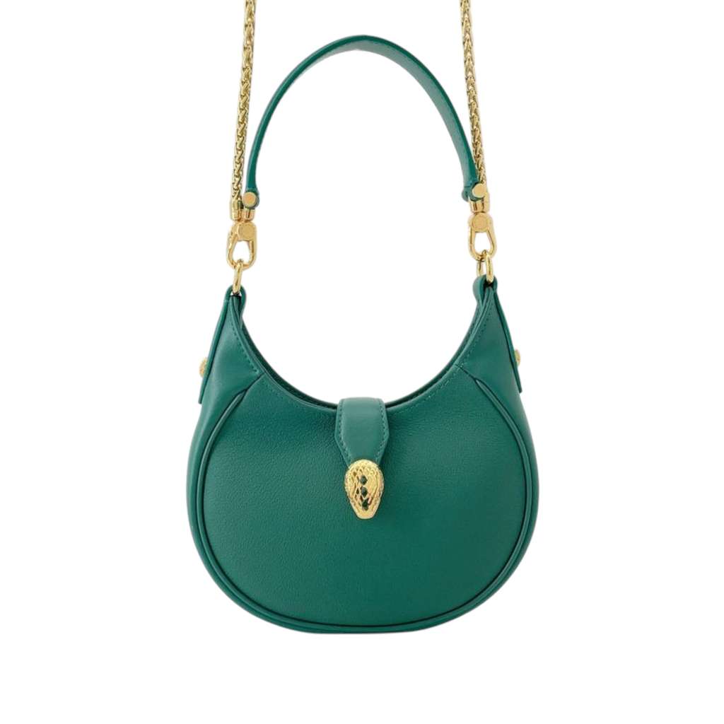 The Serpenti Ellipse features a leather body, a detachable flat leather handle, an adjustable and detachable chain link strap with leather guard, a top zip closure, a flap tab with magnetic snap closure, an exterior back slip pocket, and an interior slip pocket.