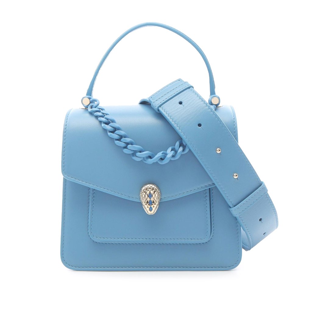 This satchel features a leather body with chain detail, a flat leather top handle, a detachable flat leather shoulder strap, a front flap with snap closure and serpenti adornment, and an interior slip pocket.