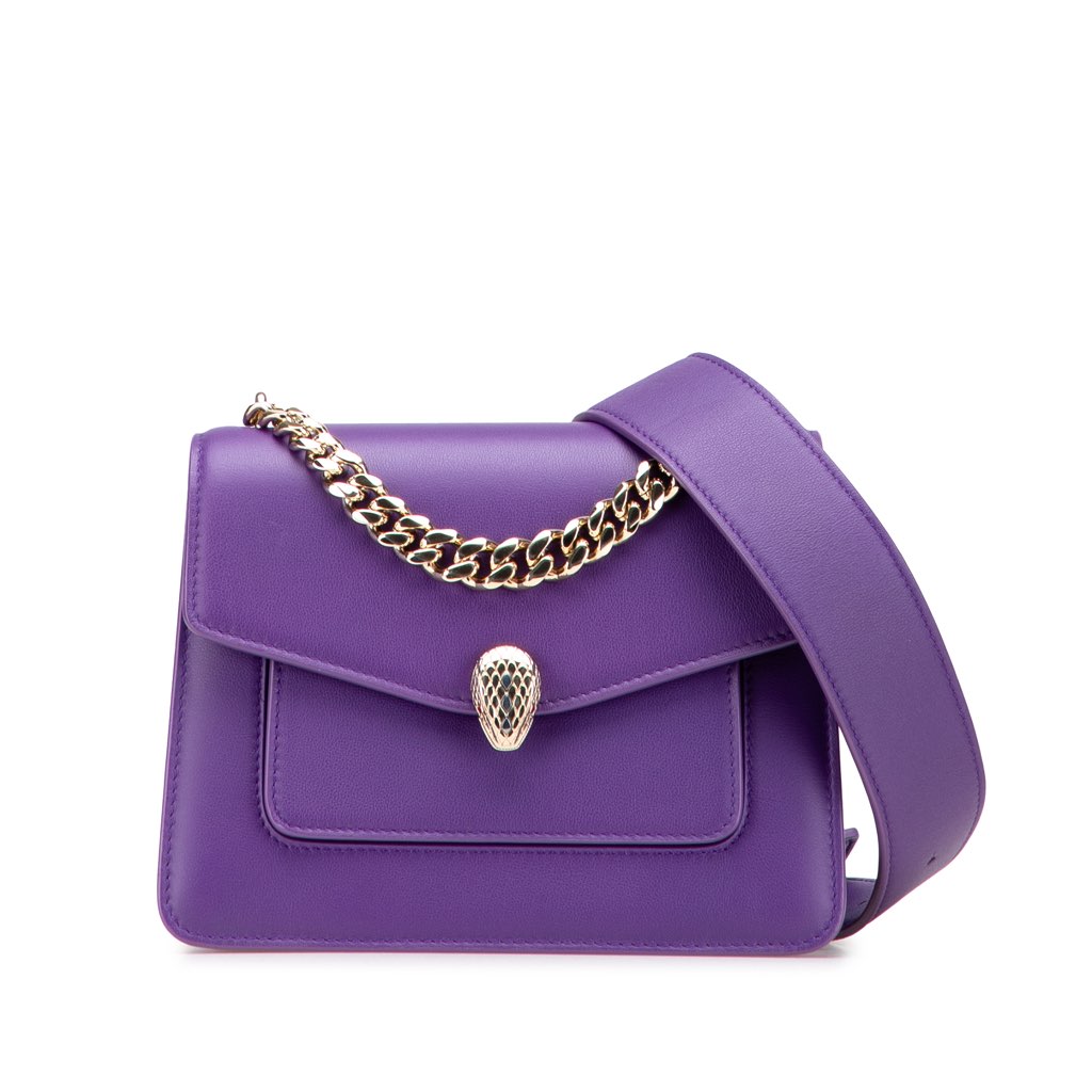 This satchel features a leather body with chain detail, a flat leather top handle, a detachable flat leather shoulder strap, a front flap with snap closure and serpenti adornment, and an interior slip pocket.