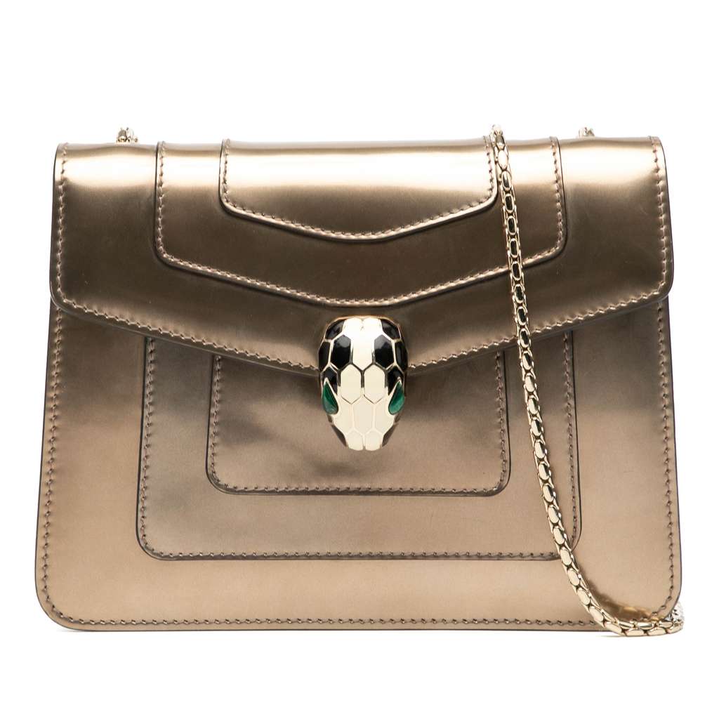 The Serpenti Forever features a patent leather body, a chain link shoulder strap, a front flap with magnetic snap closure, and an interior slip pocket.