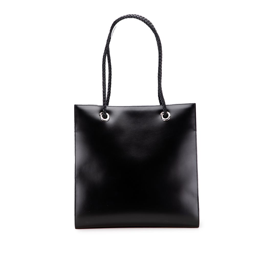 This tote bag features a leather body, double braided leather handles, an open top with magnetic snap closure, and an interior zip pocket.