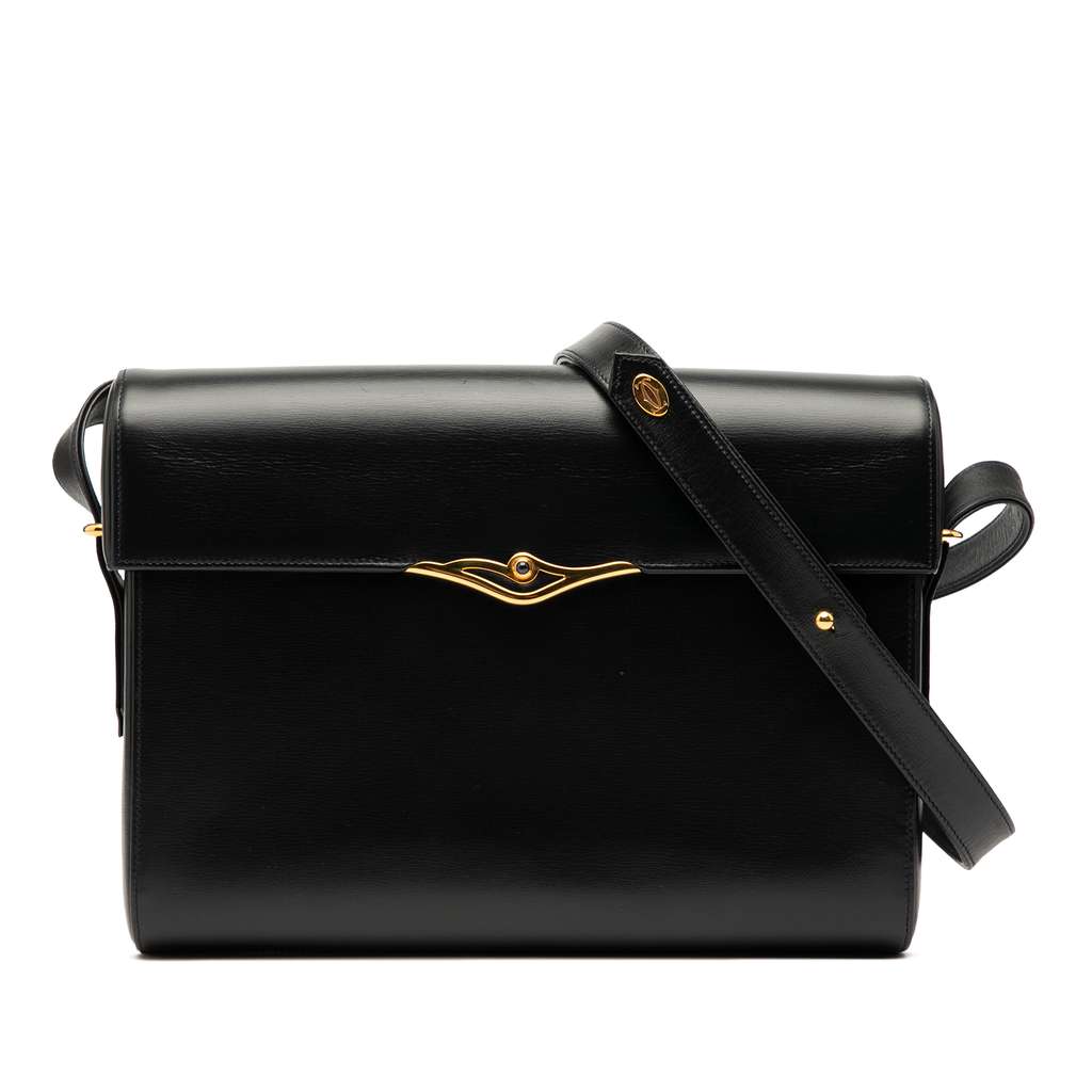This crossbody bag features a leather body, a flat leather strap, a slip through top cover, and an interior zip pocket.
