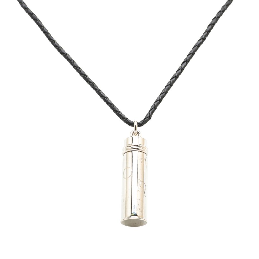 This necklace features a braided cord strap and a silver plated pill case pendant.
