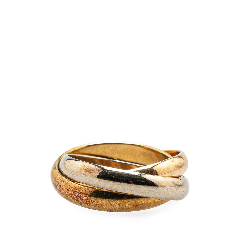 The Trinity ring features an 18K yellow gold, 18K rose gold, and 18K white gold body. US Size 6.