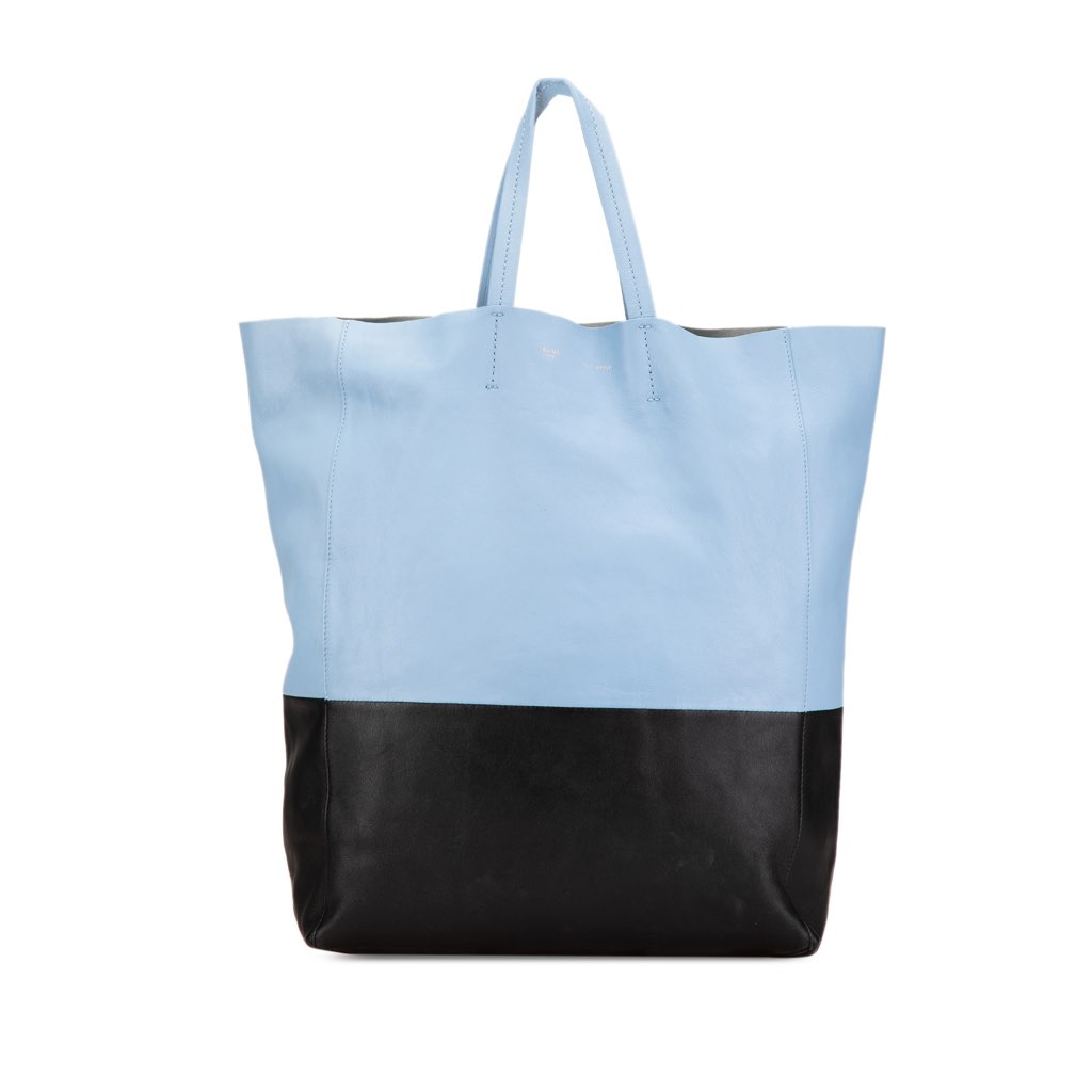 This tote bag features a bicolor leather body, flat leather straps, an open top, and an interior zip pocket.