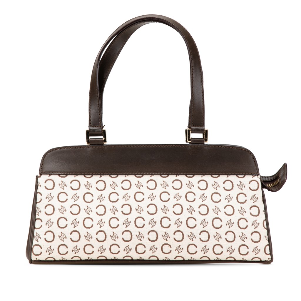 The C Macadam handbag features a canvas body with leather trim, flat leather handles, a top zip closure, and an interior zip pocket.